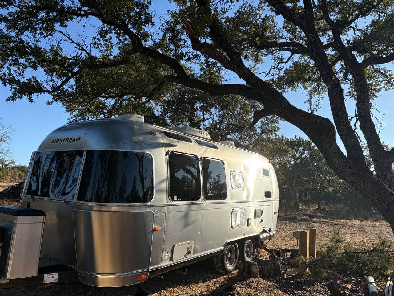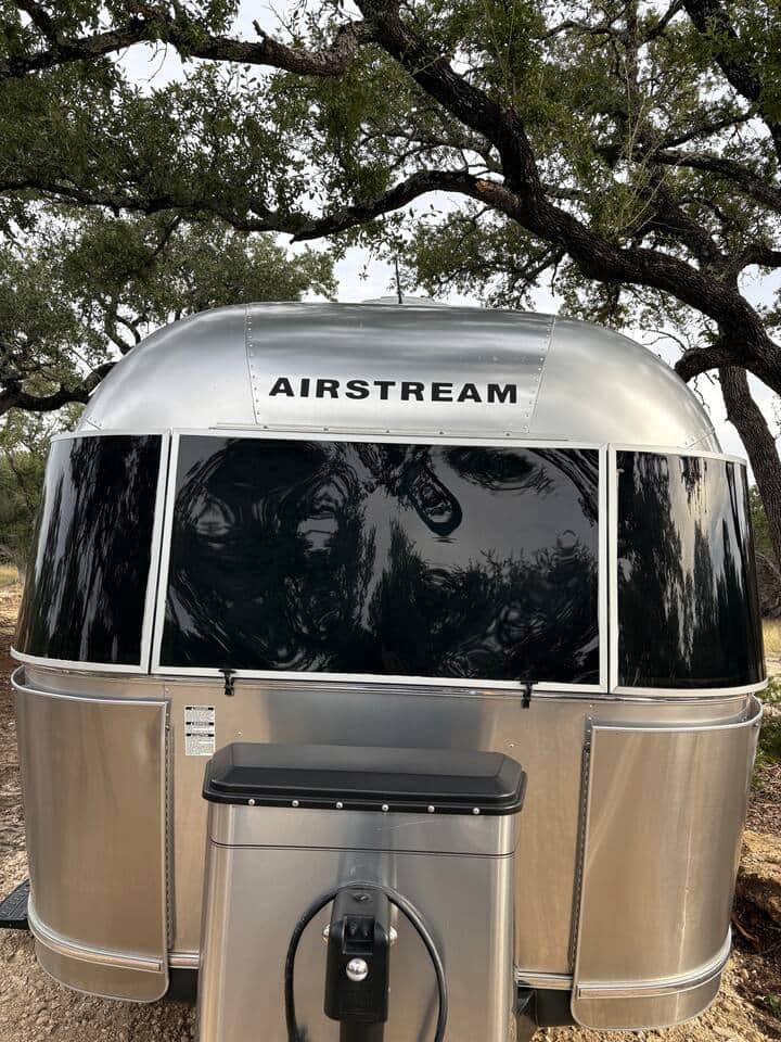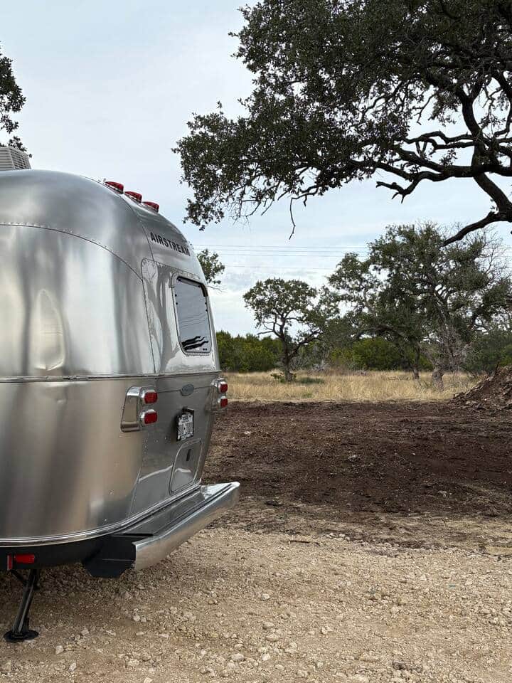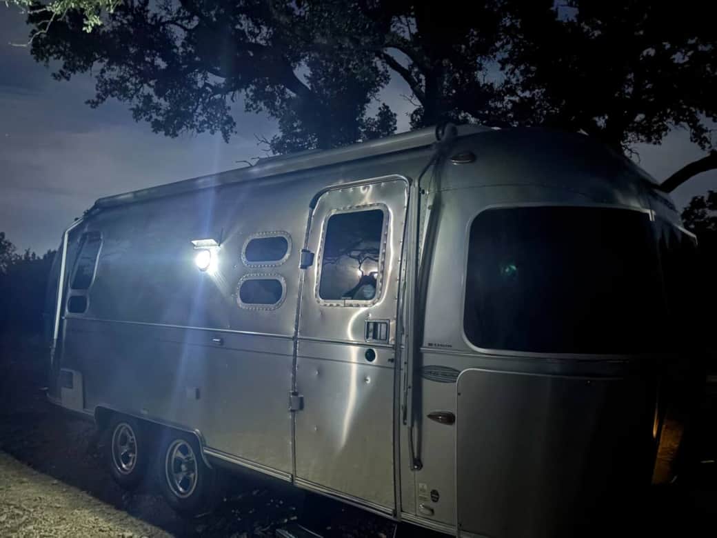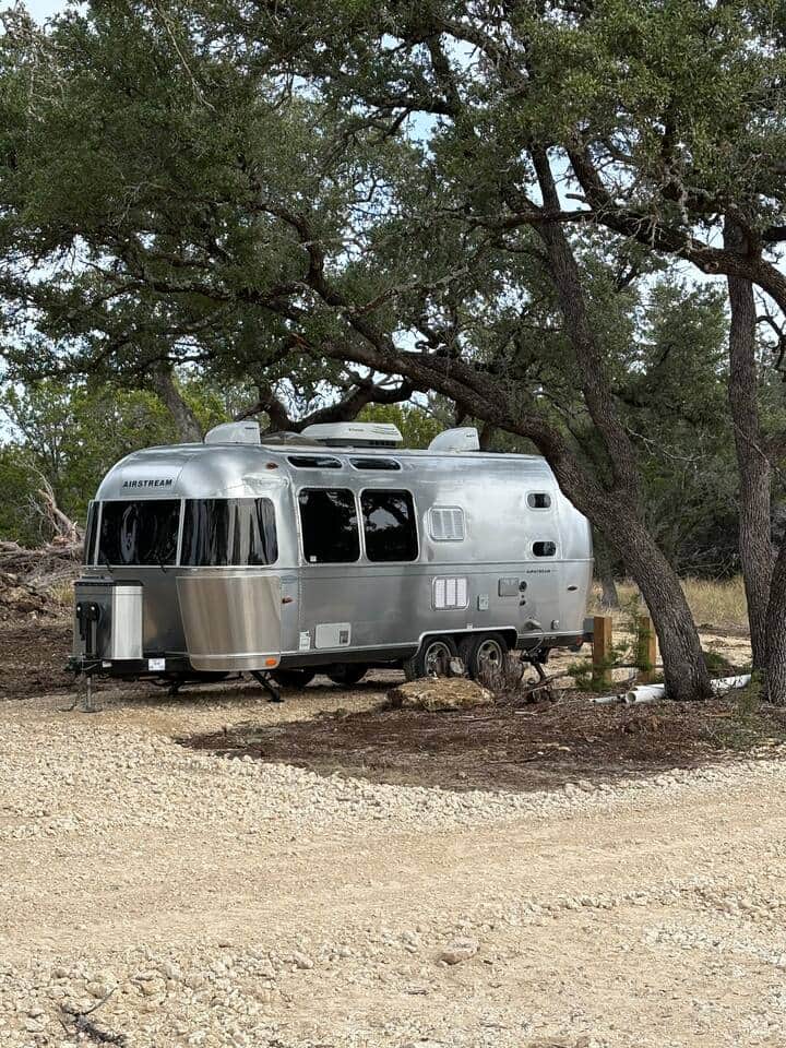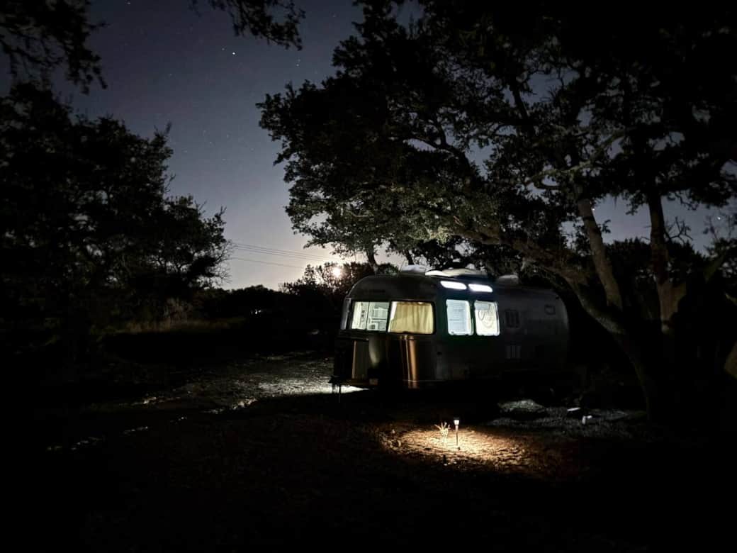 Tucked among oak groves, cactus and rugged terrain of the northern hill country, our 23-foot Airstream trailer glows softly beneath a calm moonlit sky. Its polished aluminum reflects the shimmer of the night while the quiet forest surrounds it in stillness. This peaceful hideaway invites you to unplug, slow down, and reconnect with nature—where the only agenda is fresh air, open space, and the gentle sounds of surrounding farm life and nature.